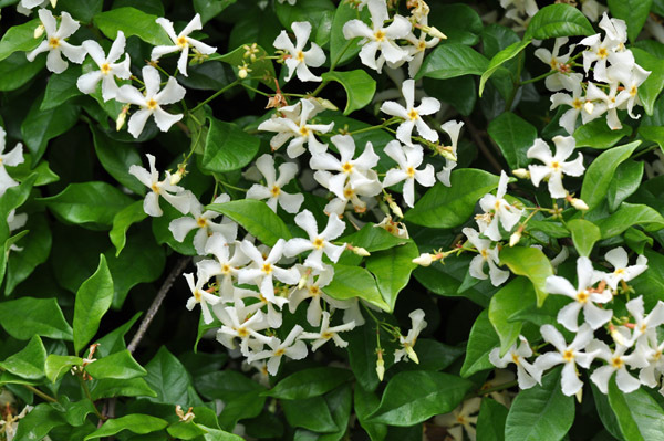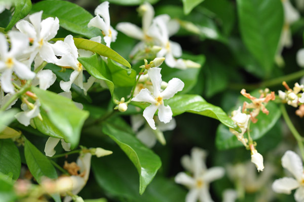 プロペラのような、風車のような白い5片の花びらが風に揺れてジャスミンのような芳香が漂います。