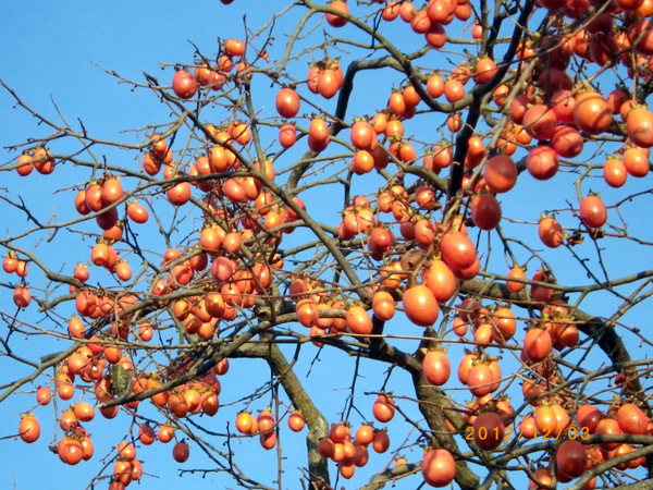 晩秋の山野で、夕焼け色に光る柿の実は冬の前のドラマチックな奈良に相応しい光景です。