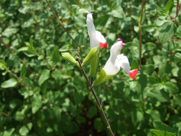 赤白のツートンカラー。別名苺ミルクの名前通り、甘く可愛らしいその姿。サルビアの仲間のチェリーセージの園芸種のホットリップスです。花期は5月から11月で、長い間その花が楽しめるのが嬉しい限りです。また、その時期によって、赤一色の花が出たり、ハーフだったり、白が強かったりと、変化が楽しめるのもいいですね。花の形がちょっとユニーク、金魚のような・・・?小鳥のような花が(何に見えますか?)二輪ずつ並んで咲きます。花言葉は“燃える想い”!!情熱的ですね。さすがメキシコ、南米原産です。だんだんと寒くなってきて、枯れ葉舞い散るこの季節にこの明るさがいいですね。