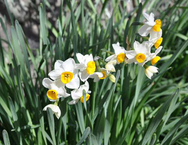 一年中で一番花の少ないこの時期に、やはり咲くのは水仙の花。この「日本水仙」の花を求めて近所を探し歩くと、神社の境内にありました。きょうは寒いけれど日差しも良く、白に黄色の花と緑の葉がすがすがしいコントラストを創っています。寒い時期に出会うとホットします。